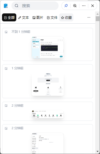 FocusAny 内置的剪切板管理底层会自动记录剪切板历史记录,通过安装剪切板管理插件,可以实现剪切板的历史管理、搜索、收藏。