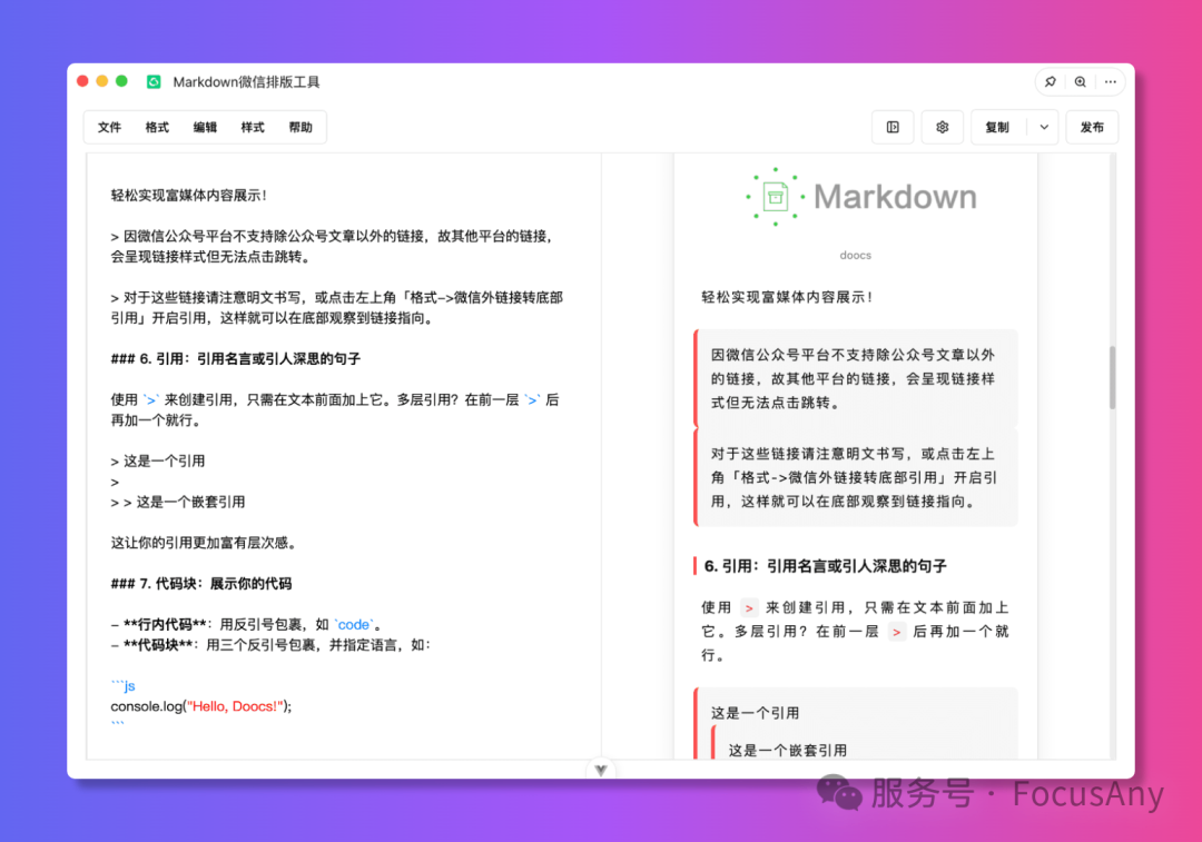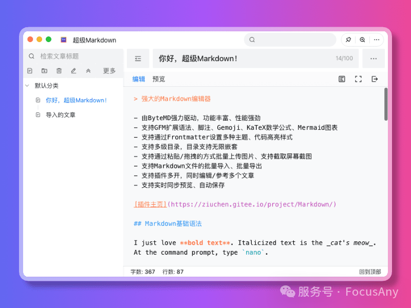 如果你是一个 Markdown 爱好者,那么 FocusAny 也是一个非常好的 Markdown 编辑器。通过安装 Markdown 插件,可以实现 Markdown 文件的管理和编辑。